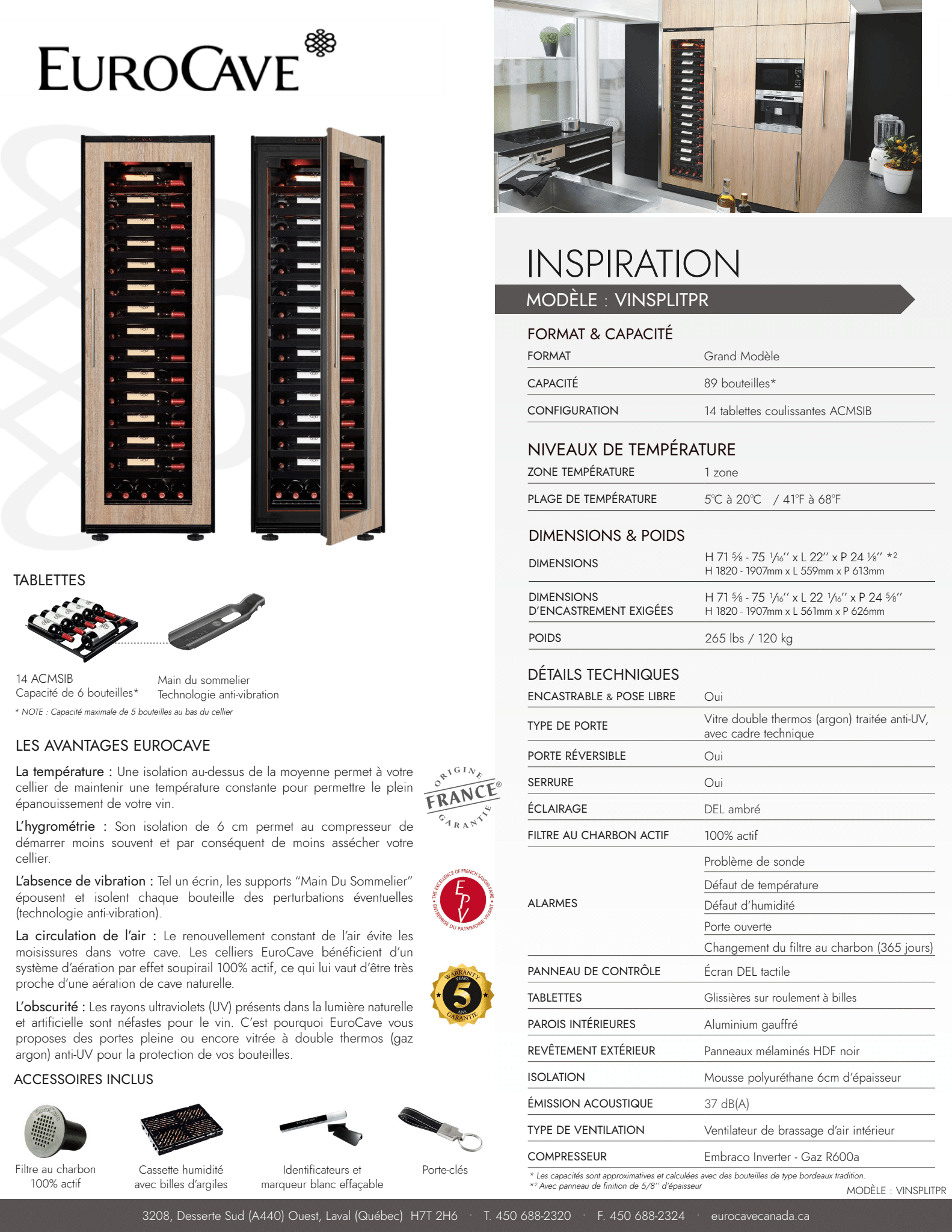 Adjustable from 5 to 20°C , this cellar recreates the exact conditions of a natural cellar to store up to 89 bottles * of your wines over the long term: a controlled temperature, an adapted humidity level favored by aluminum walls, a permanent ventilation system, UV protection, protection against vibrations thanks to the design of the cellar itself and 14 sliding shelves equipped with the sommelier's hands.