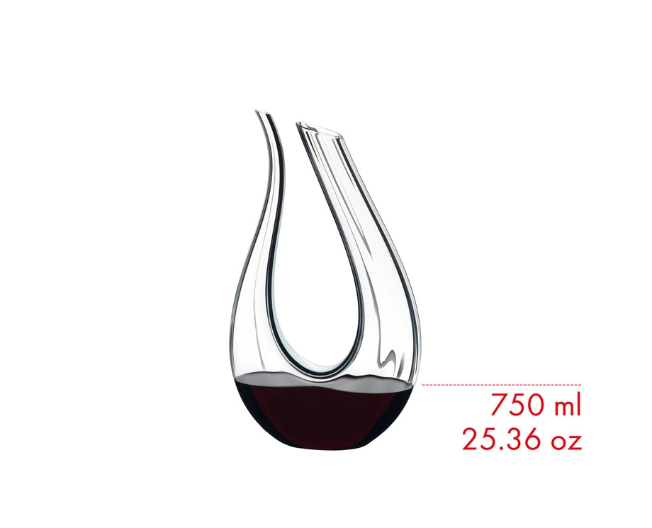 The Amadeo was launched in 2006 to celebrate RIEDEL's 250th anniversary. Named after Austrian composer Wolfgang Amadeus Mozart, whose 250th birthday was also celebrated the same year as RIEDEL's, this mouth-blown decanter is shaped like a lyre and serves wine divinely. Wine is simply aerated or decanted through the wider opening and poured through the narrower end.