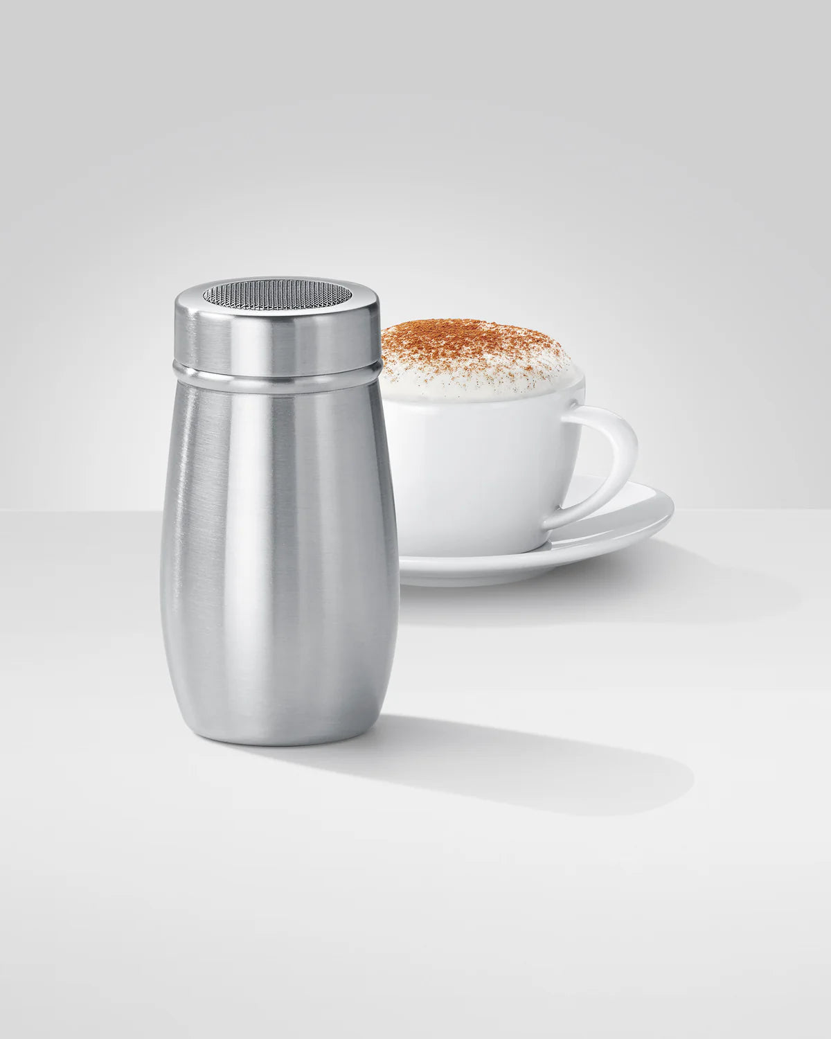 Agrémentez votre cappucino de fine poudre de chocolat en utilisant cette élégante saupoudreuse de cacao en acier inoxydable avec couvercle saupoudreur pour un saupoudrage toujours parfait.