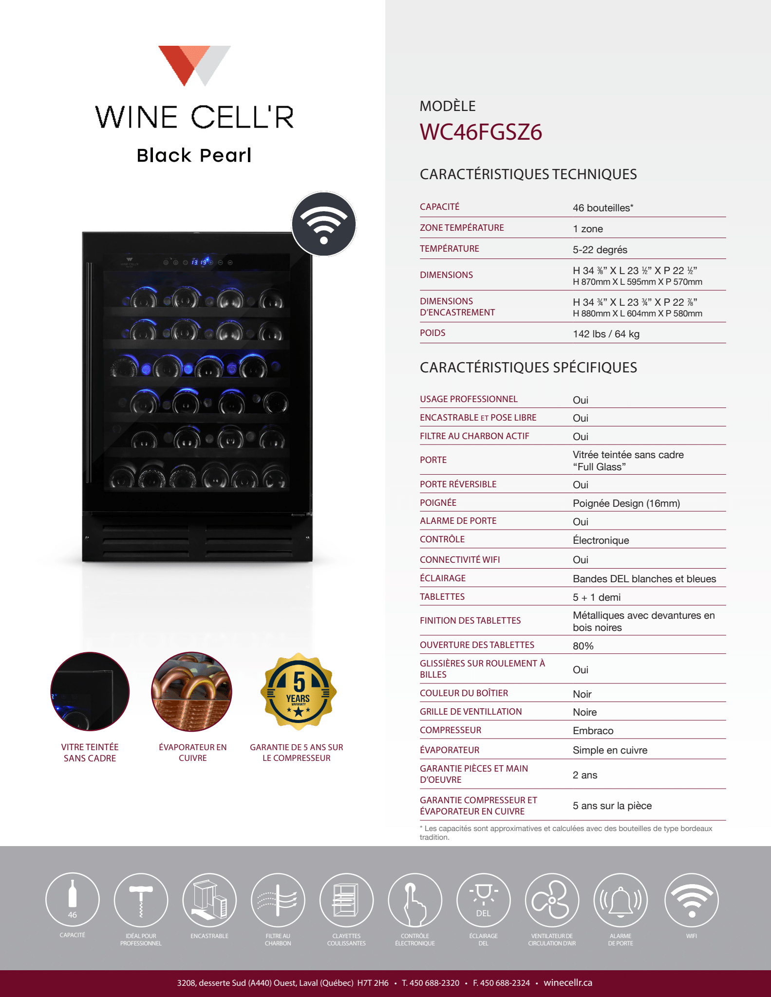 Wine Cell'r Black Pearl 46* bottle cellar, 2 zones, glass door, WC46FGDZ6