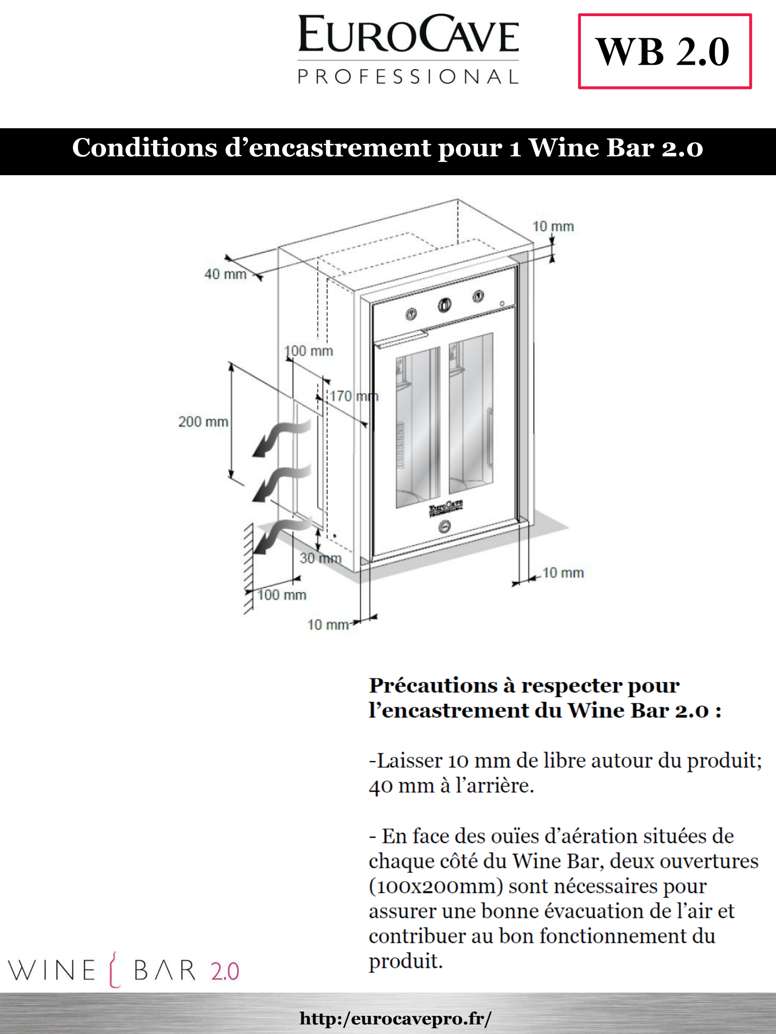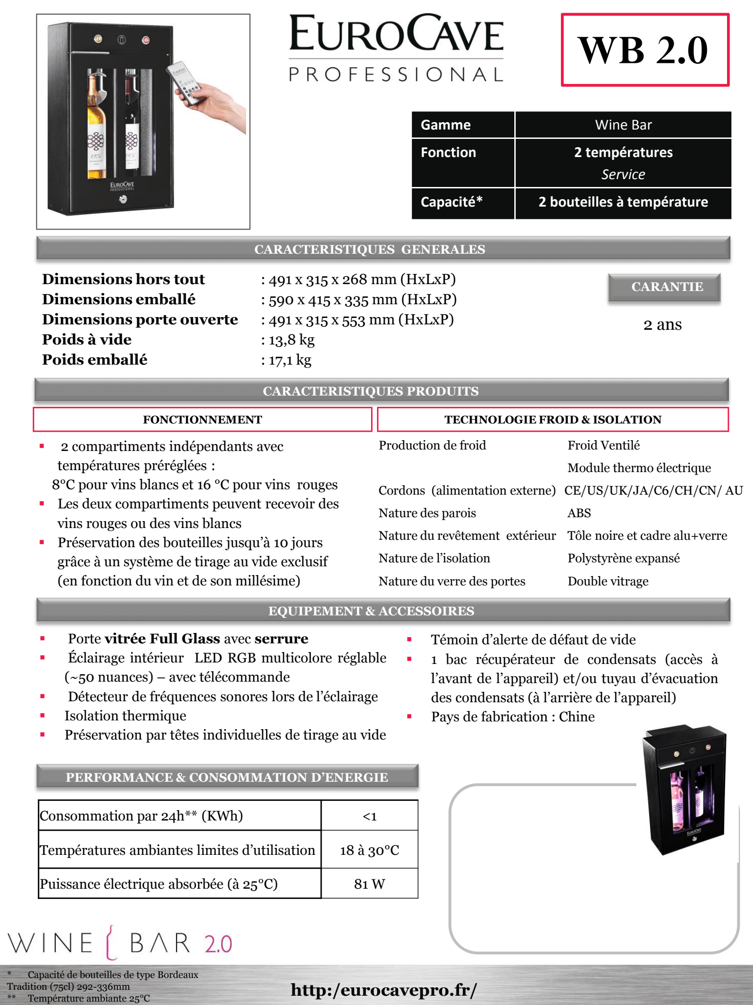 The Eurocave 2.0 wine bar keeps two opened bottles at the correct serving temperature for 10 days thanks to its Activ Protect vacuum system. With no consumables, it meets the needs of professionals looking to offer quality wine by the glass service. It's also possible to combine several 2.0 wine bars side by side to offer 4, 6, or 8 bottles...